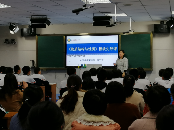 来自济南中学的马宁宁老师,首先给高二学生讲了一节《物质结构与性质》先导课。马老师的课低调奢华有内涵,带领着学生进入了神奇的微观化学世界,整节课设计紧凑合理,马老师循循善诱、深入浅出启发学生的思维,课堂组织严谨有序、流畅自如,充分调动了学生的学习热情,激发了学生探究化学的欲望。整堂课轻松活泼,学生踊跃发出自己的声音,得到了在场所有老师的一致好评。